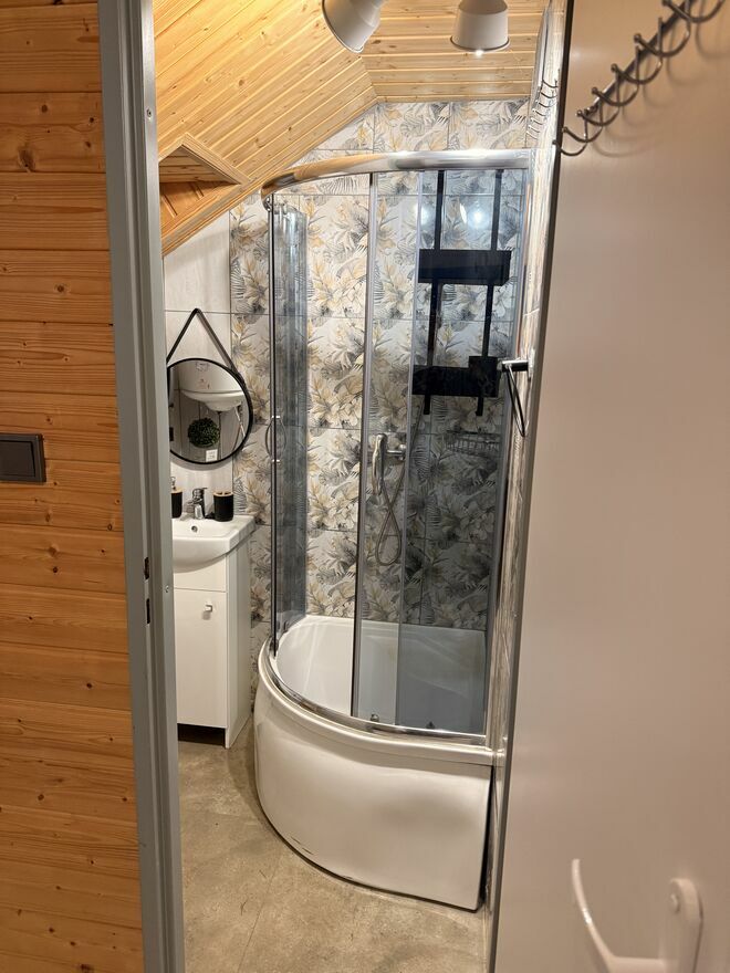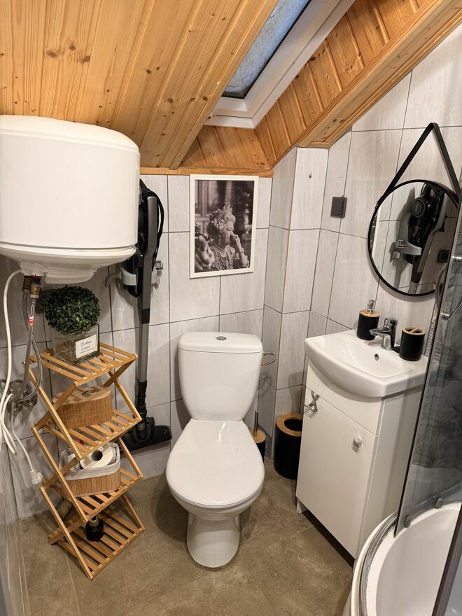 Toaleta z WC i prysznicem dostępna zarówno na dole jak i na górze.
