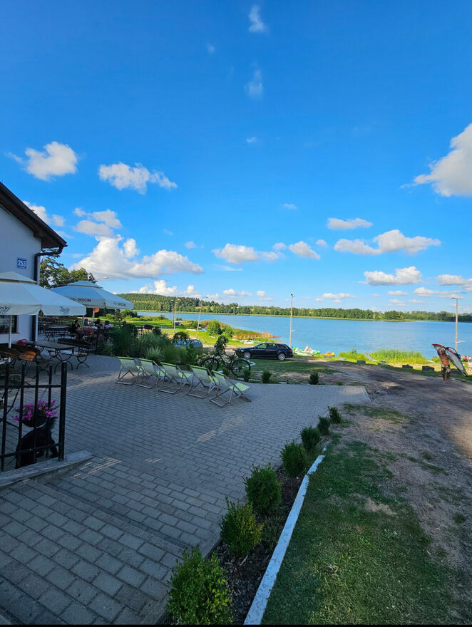 Na posesji trampolina, zjeżdżalnia, hamak, huśtawka, leżaki, , zestaw Mamut z Ikei dla dzieci (stolik + krzesełko), mały domek ogrodowy dla dzieci, zabawki, deska SUP. Jezioro widoczne z tarasu, przy plaży znajdziemy bar, można tam zjeść rybę i nie tylko oraz wypożyczyć sprzęt wodny.